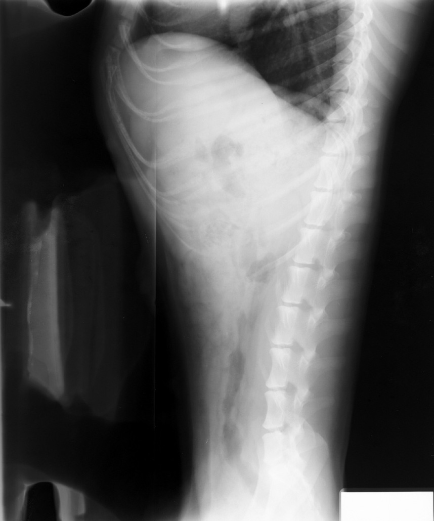 Overlapping of two films in automatic processor. Note artifact along one long edge of each film.