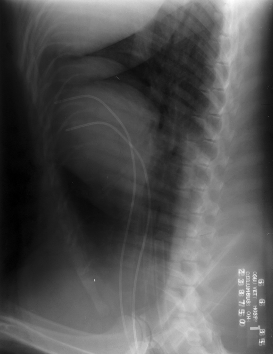 Double exposure during an angiocardiogram. This film was in a special automatic film changer, which jammed and did not move the film out of the way as it should have; therefore a double exposure occured.