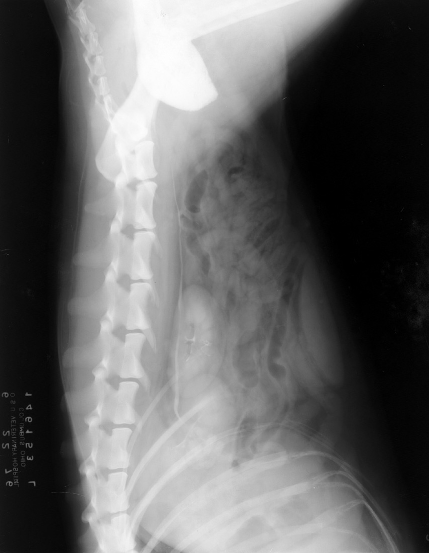 On this IVP, not the odd appearance of the right kidney. A knot from a lead rope was lying underneath the dog's body when the film was taken.