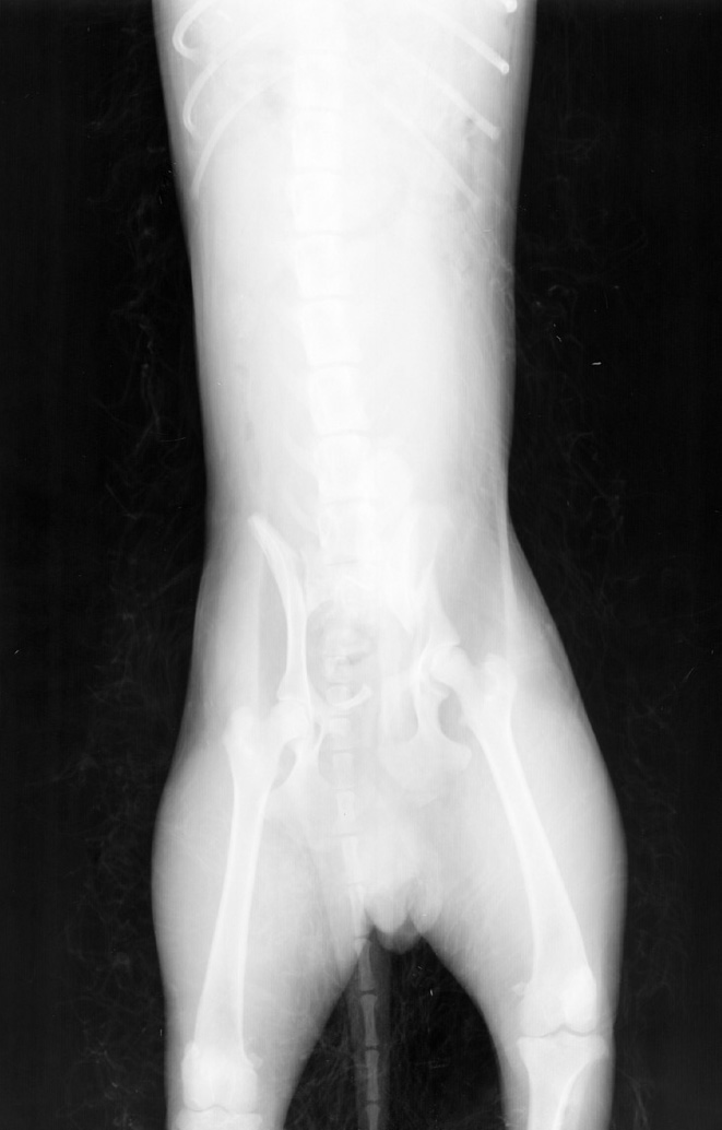 White linear artifact seen over the dog's abdomen due to prescence of wet hair coat.